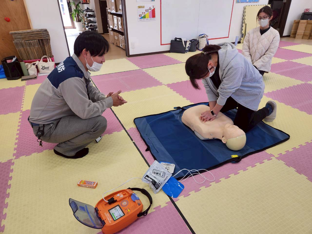 先日、スタッフ全員が参加し、AEDを使った心肺蘇生法や止血方法、事業所にある身近なものを使った